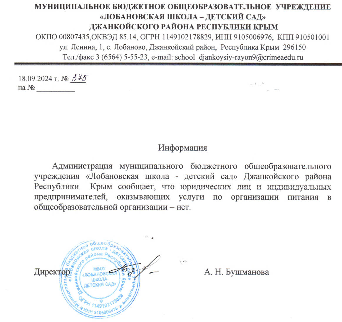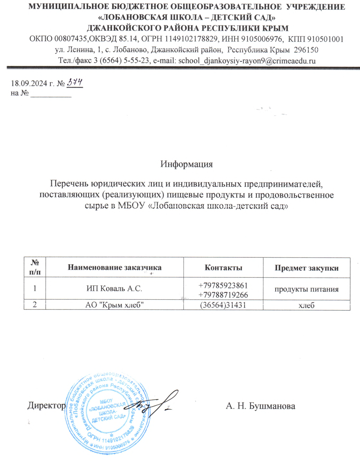 По любым вопросам организации и качества питания обучающихся МБОУ «Лобановская школа - детский сад» вы можете обратиться к директору школы Мусихину Владимиру Владимировичу